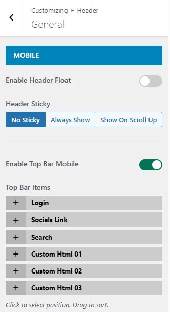 - Allows you to display custom elements in each section position, enhancing functionality and flexibility of the header mobile.
